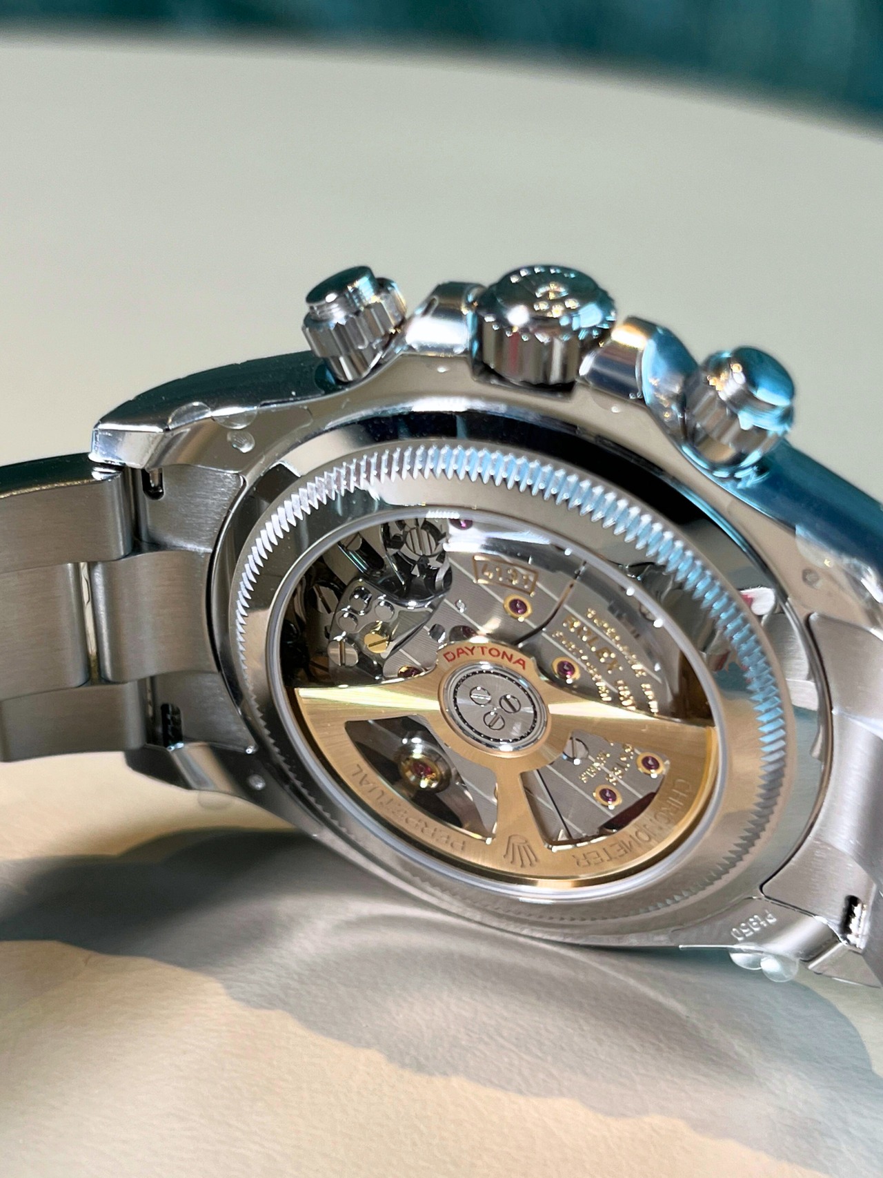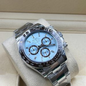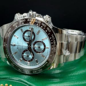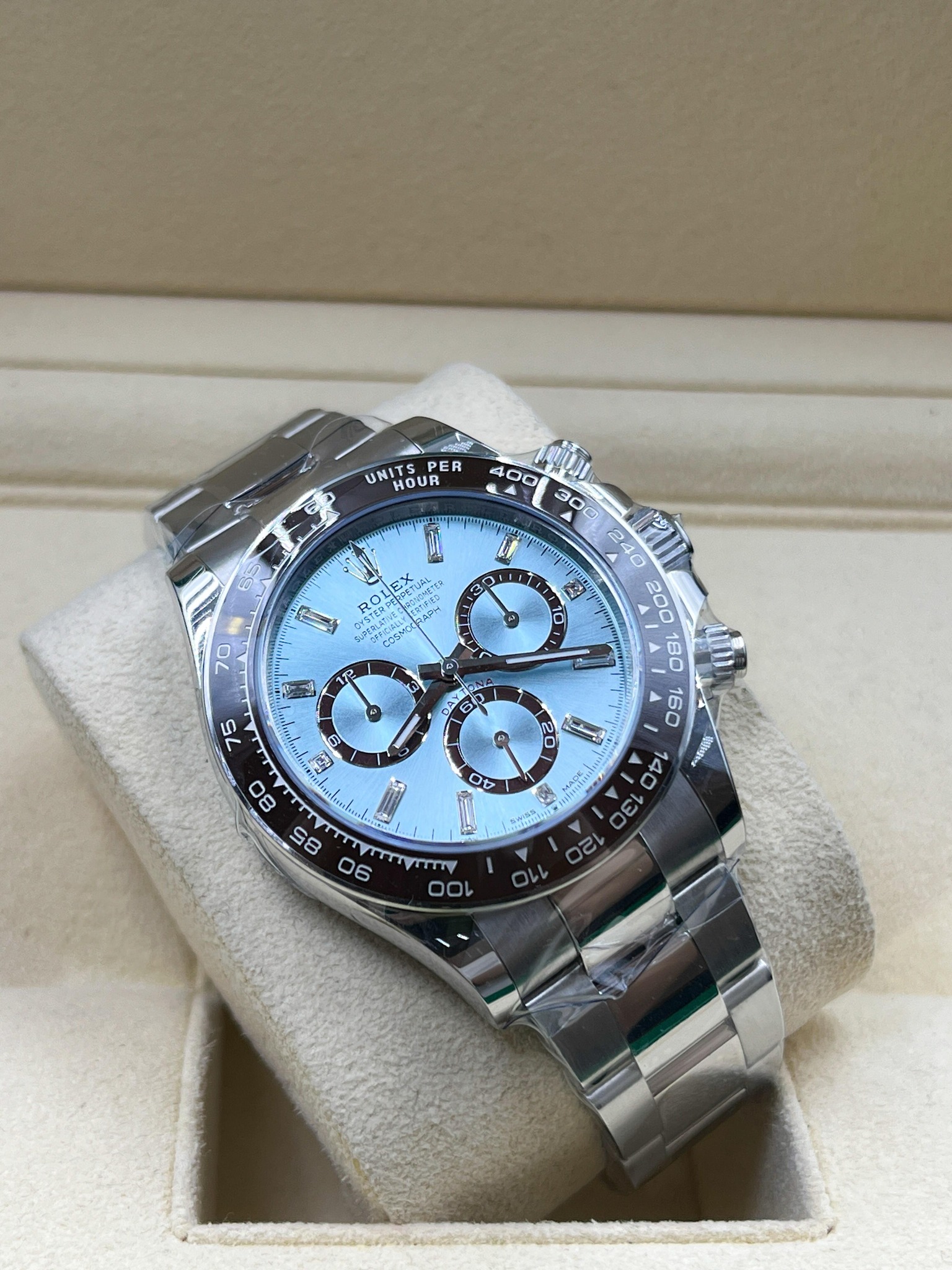 This extraordinary timepiece (126506-0002) is the first to use 950 platinum to create a case, with an ice blue dial and a brown Cerachrom ceramic bezel, showing a unique and elegant temperament. The iconic three-counter design and the platinum tachymeter outer ring perfectly interpret the essence of racing timing. Equipped with the brand's latest 4131 automatic winding movement, equipped with a Chronergy escapement system, it provides a 72-hour power reserve. The transparent sapphire crystal bottom cover debuts in the Daytona series for the first time, allowing you to see the exquisite movement craftsmanship at a glance. The Oyster bracelet is equipped with an Oyster safety buckle to ensure comfortable and safe wearing. The perfect combination of 100-meter waterproof performance and top-grade materials makes this legendary timepiece with both collection value and practical functions a masterpiece of Rolex watchmaking craftsmanship.