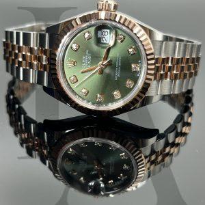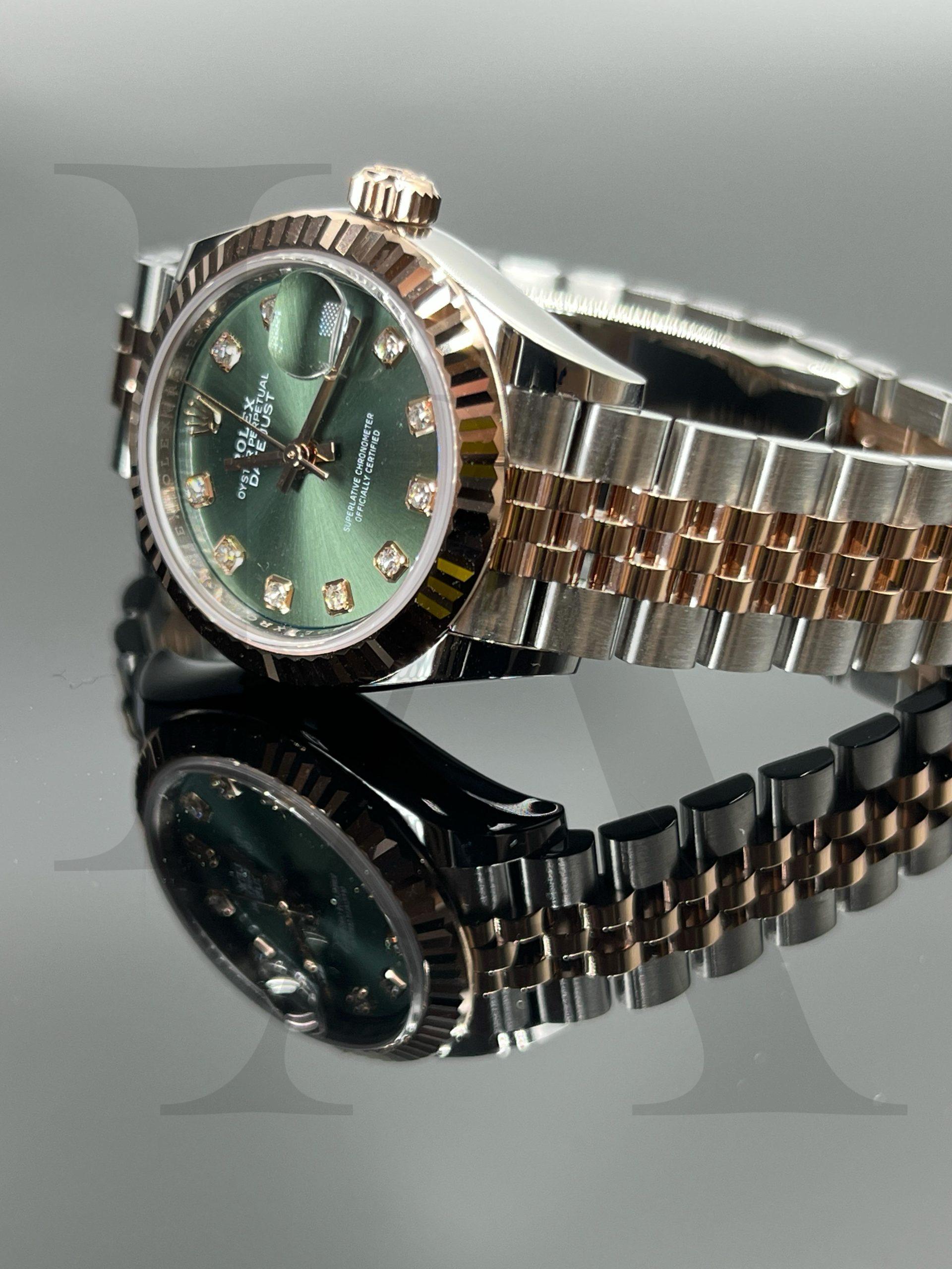 Model No. 279171-0007 Type Lady Datejust Case Material Everose Gold Steel Case Diameter 28mm Dial Color Olive green with diamonds Strap Jubilee Calibre Rolex Cailber 2236 Water Resistance 100m/ 300 feet -